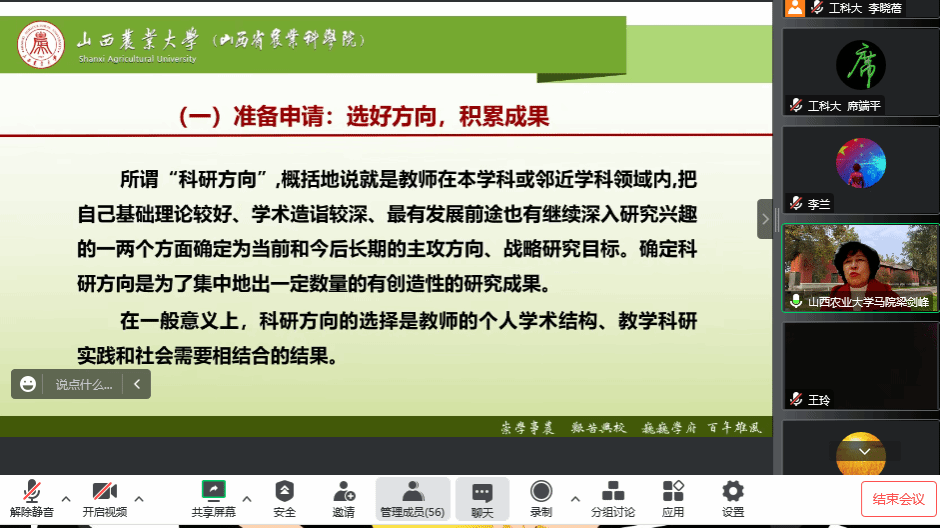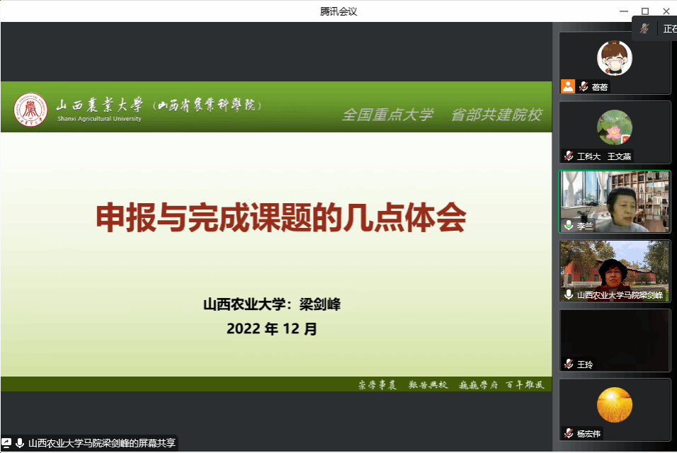 2022年12月1日19:30,思政部举办了主题为“申报与完成课题的几点体会”科研专题讲座,特别邀请了山西农业大学马克思主义学院院长梁剑峰教授主讲,讲座主要围绕社科类项目的申报与结题,对思政部教师撰写科研申报书和研究工作进行了一次具体深入的指导。